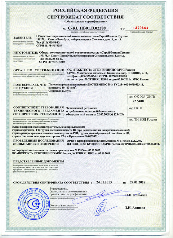 Пенополиуретан (ППУ) является самозатухающим и трудновоспламеняемым материалом. Он не поддерживает горение (Г2) и имеет класс пожарной опасности КМ3 - практически не выделяет вредных веществ.